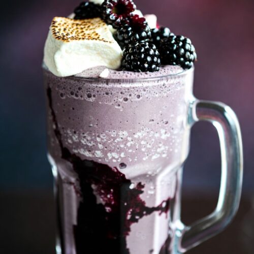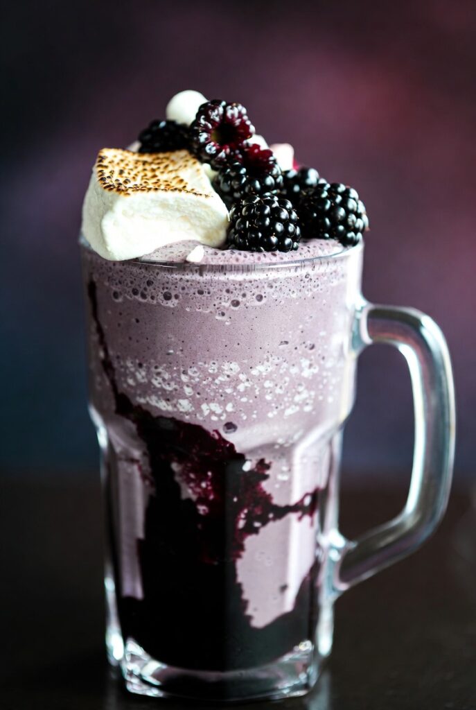 This blackberry and marshmallow milkshake is rich, creamy, and slightly tangy with deep berry flavor balanced by sweet toasted marshmallow. It features a vibrant blackberry syrup swirl, a smooth vanilla-berry shake base, and a fluffy toasted marshmallow topping for a dramatic finish.