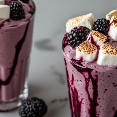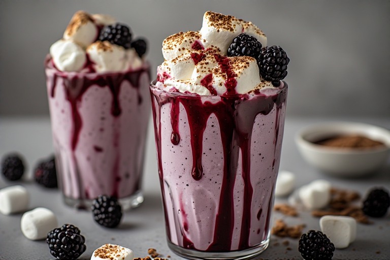 This blackberry and toasted marshmallow milkshake is rich, creamy, and slightly tangy with deep berry flavor balanced by sweet toasted marshmallow. It features a vibrant blackberry syrup swirl, a smooth vanilla-berry shake base, and a fluffy toasted marshmallow topping for a dramatic finish.