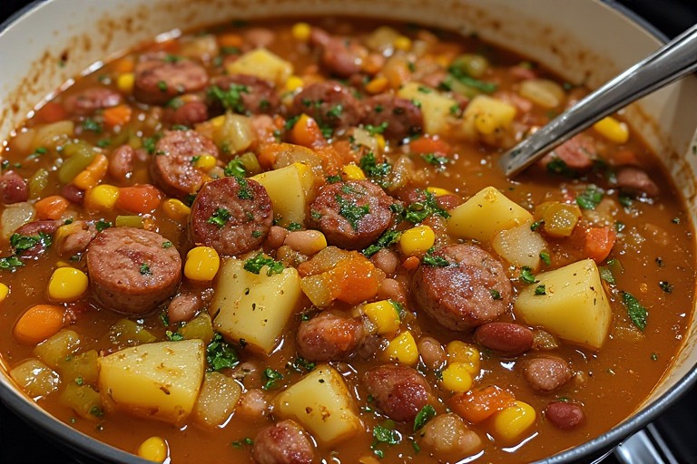 - Add the cubed potatoes and return the sausage to the pot. Reduce heat to medium low and simmer uncovered for 20 to 25 minutes until potatoes are fork tender. Stir in corn and kidney beans and simmer 8 to 10 minutes more. Season with salt and black pepper to taste.