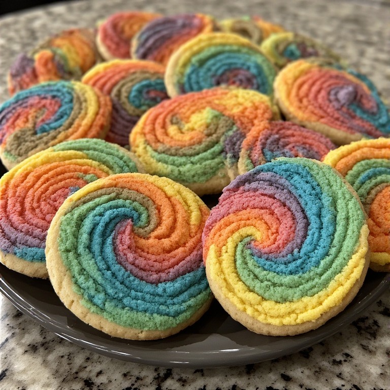 These colorful swirl cookies are soft, buttery sugar cookies with vibrant streaks of color running through each slice. They are eye-catching, fun, and perfect for parties, birthdays, or themed dessert tables. The dough is tinted in multiple shades, layered, rolled together, and sliced to reveal a beautiful marbled or spiral pattern.
