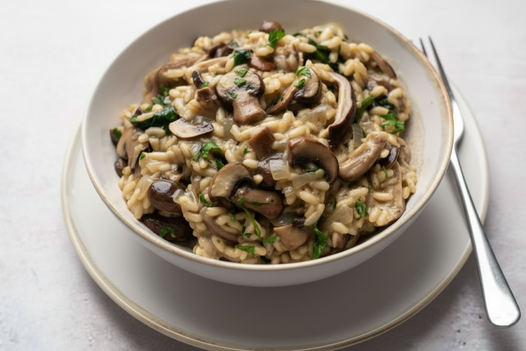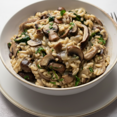This creamy mushroom risotto is a classic Northern Italian rice dish made by slowly adding warm broth while stirring. Rich, velvety, and comforting, it’s finished with Parmesan and butter for a luxurious texture.