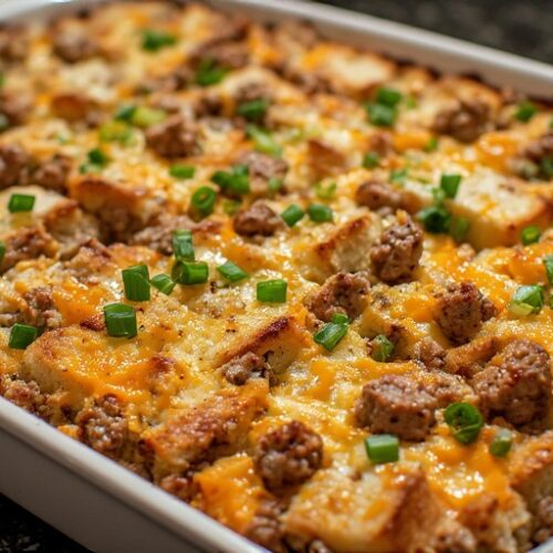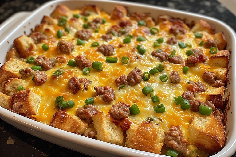 Layers of bread soak up a rich egg mixture while savory sausage, melted cheese, and a few tender vegetables bake into every bite. The result is a golden casserole that comes out of the oven warm and bubbly, ready to slice and serve.