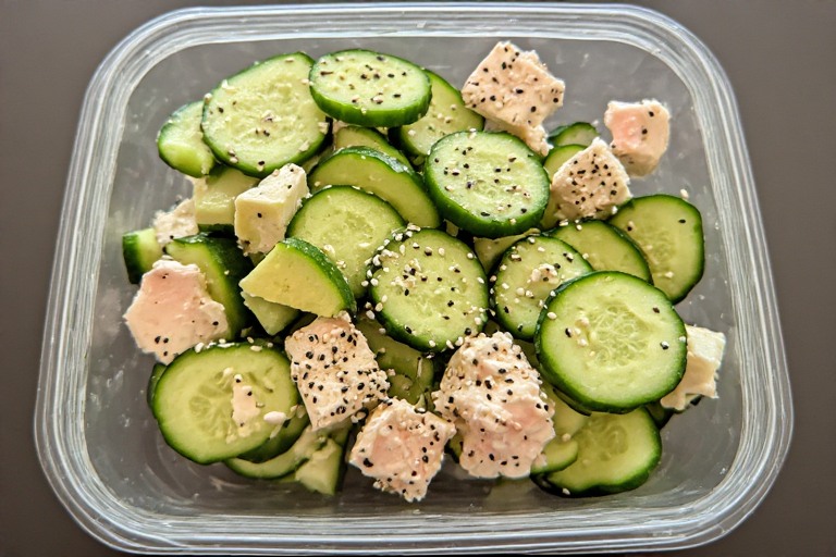 - If using a container or jar with a lid, seal it tightly and shake until everything is well coated. If using a bowl, stir gently until the dressing is evenly mixed and the cucumber is nicely coated. Do not overmix so the avocado keeps its shape.