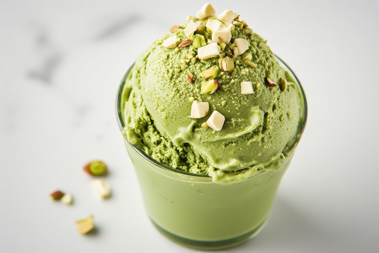 Top with chopped pistachios, white chocolate shavings, and a light matcha dusting.