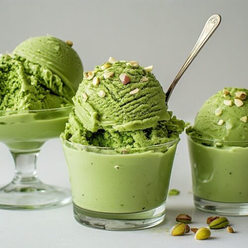 Serve the dessert in clear glass cups so the melting gelato and green matcha swirl are visible. Garnish with finely chopped pistachios, delicate white chocolate shavings, and a light dusting of matcha for a polished look.