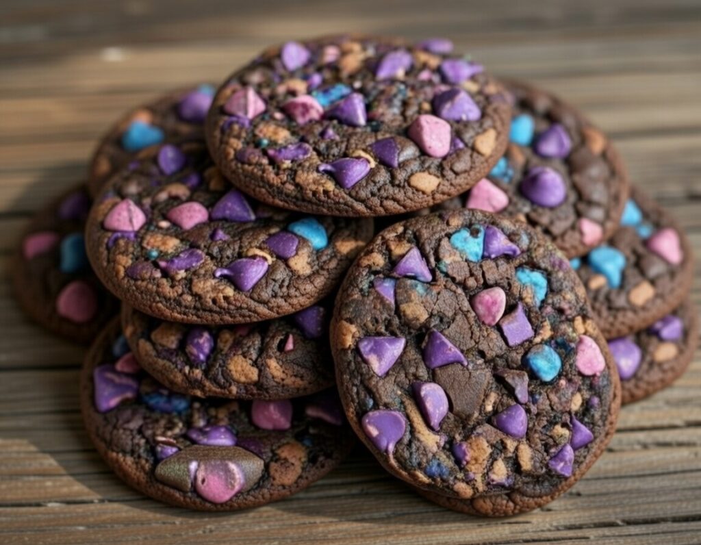 This cookie is a thick, bakery-style double chocolate cookie packed with vibrant purple, blue, and pink chocolate chips. The dark cocoa base makes the colorful chips stand out, creating a dramatic “galaxy” look. The texture is soft and fudgy in the center with slightly crisp edges.