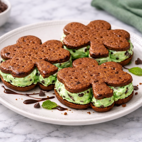 These Minty Ice Cream Shamrocks are a festive St. Patrick’s Day dessert made with soft chocolate cookies sandwiched around creamy mint chocolate chip ice cream. The playful shamrock shape and refreshing chocolate-mint flavor make them perfect for holiday dessert tables, family gatherings, or a fun baking project with kids.