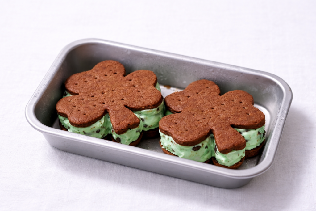 A festive chocolate cookie ice cream sandwich perfect for St. Patrick’s Day
