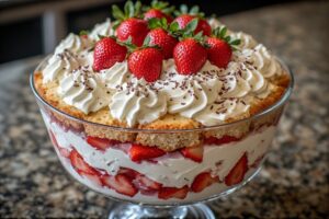 A strawberry shortcake trifle fits beautifully on an Easter dessert table. Layers of soft cake,…