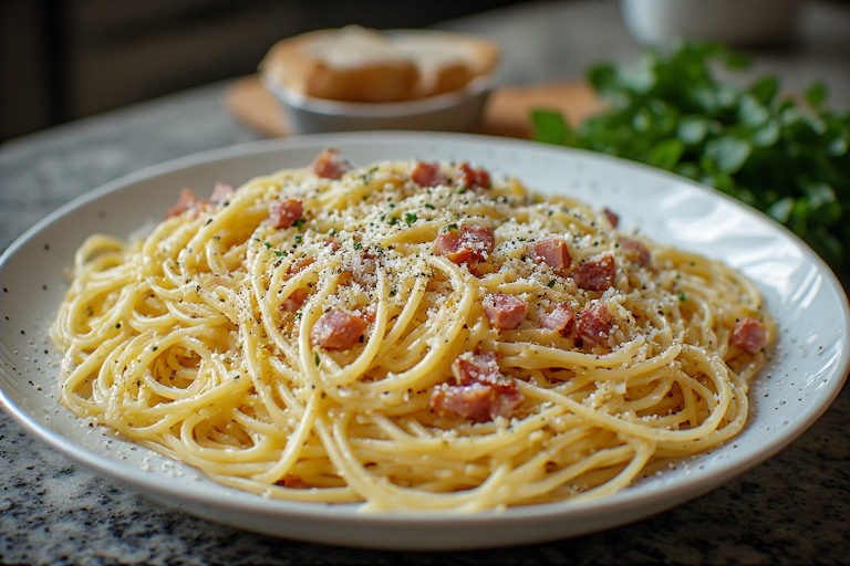 The beauty of carbonara lies in its simplicity and technique. When made correctly, the eggs and cheese transform into a silky, creamy sauce that coats every strand of spaghetti. There is no cream involved at all. The creaminess comes entirely from the emulsification of eggs, cheese, rendered pork fat, and a little starchy pasta water.