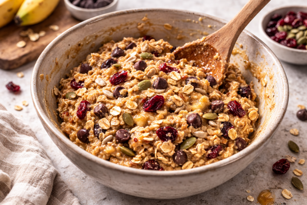 Add the oats, baking powder, cinnamon, and salt. Stir gently until the mixture is evenly combined. - Fold in the mix-ins.